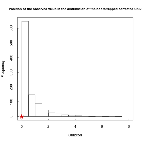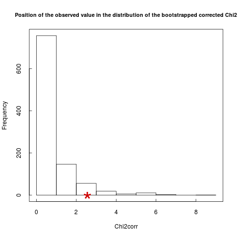 In this example, the test is not significant; the observed corrected chi-square is within the bootstrapped distribution (red star in Figure 6). The conclusion is that the proportion of doubly positive hosts can be explained without invoking an interaction between the two parasites.
