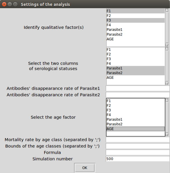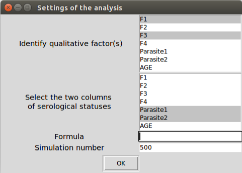 In both cases, you must designate the variables that must be defined as factors and the two variables of serological statuses (the software will automatically convert these variables into factors). Moreover, the model formula (i.e., a symbolic description of the model of risk factors) and the number of wanted bootstraps (500 by default) must be filled.